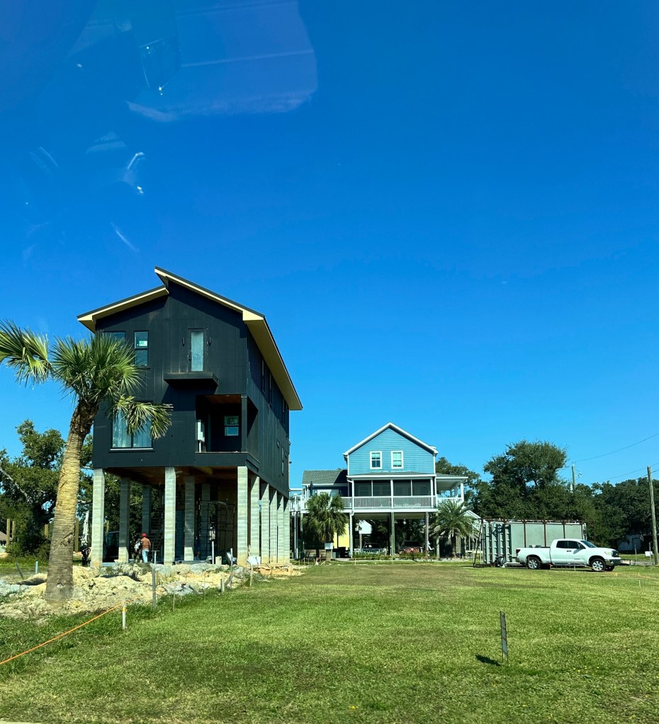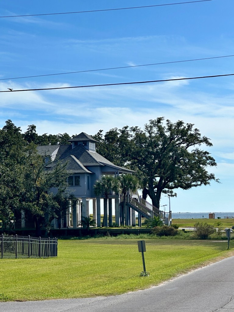 About 40 min from Biloxi down the Gulf Shore is the cute little beach town of Bay Saint Louis, Mississippi. It’s old, incorporated in 1882; it was a pivotal location in the war of 1812 with the British. But this little town gets brushed or hit by a hurricane about every 2 1/2 years, so its old but new again..and again..and again. This iteration is a row of bars where the locals come down in their golf carts, have a drink and listen to live music. We walked by 6 bars with 6 loud competing bands. It’s definitely a party vibe.