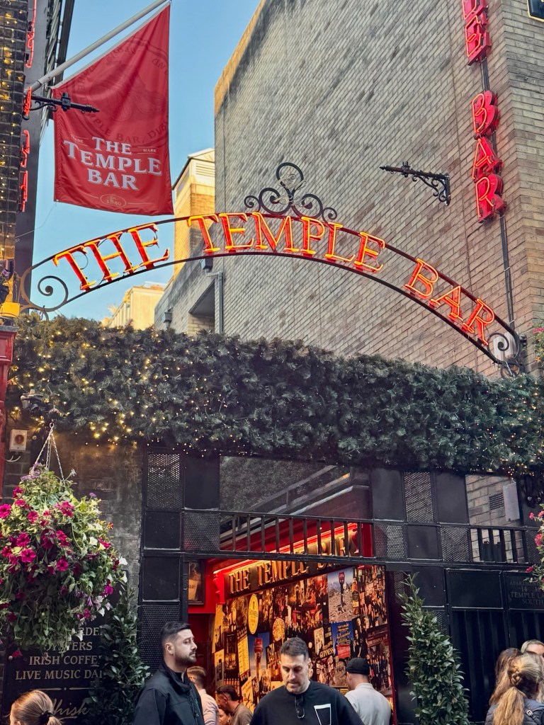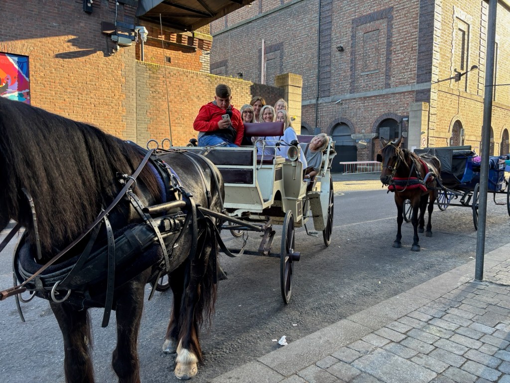 Our last stop for the evening was Temple Bar, Dublin’s most famous nightlife district. It’s about a 25-minute walk (or a short 10-minute cab ride) from the Guinness Storehouse — technically walkable, but after a long day of sightseeing, a few of us decided to enjoy the charm of a horse-drawn carriage through the cobblestone streets instead.