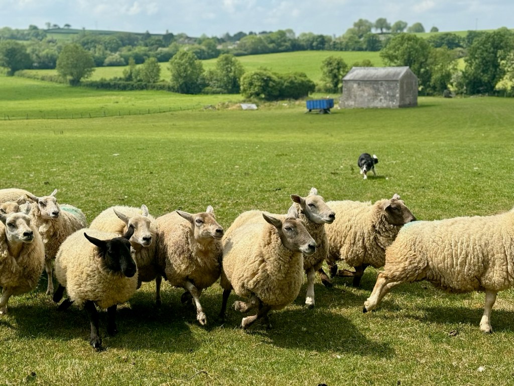 After tea, we headed outside to meet Max, one of the farm’s many border collies, and watched him in action with the resident flock of sheep. It was incredible to see how responsive he was to just a few whistle commands. Sheep farming is such an important part of Ireland’s rural life, and skilled sheepdogs like Max play an essential role — keeping the flocks together across the wide green fields with remarkable precision and teamwork.