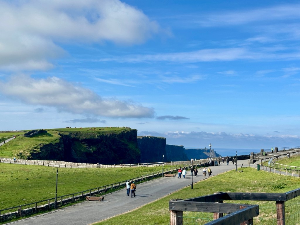 Thursday brought one of our most anticipated excursions — a visit to the world-famous Cliffs of Moher, one of Ireland’s most awe-inspiring natural landmarks. Stretching for about 5 miles (8 kilometers) along the Wild Atlantic Way, the cliffs rise to over 700 feet (214 meters) above the Atlantic Ocean, offering sweeping, dramatic views of the Aran Islands, Galway Bay, and the distant mountains of Connemara on a clear day.