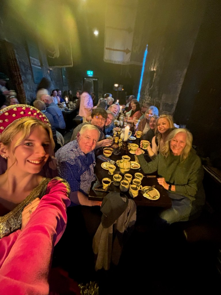 As guests of the “Lords and Ladies of the Castle,” we were regaled with music, song, and stories from centuries past, all while sipping generous cups of mead — a sweet honey wine once reserved for nobility. Dinner was served in true medieval style: hearty vegetable soup (no spoons allowed!), roasted chicken, potatoes, and plenty of wine.