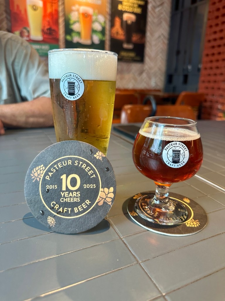 Although the street-cart food was incredibly tempting, we had been warned about the local water because our digestion would not be used to it—no drinking it, no ice, and caution with foods washed in it—so we decided to play it safe. Instead, we stumbled upon an unexpected find: Pasteur Street Brewing Company, a craft brewery founded by an American expatriate. It was a welcome and familiar stop, offering a relaxed atmosphere and a refreshing break from the heat and sensory overload of the streets.