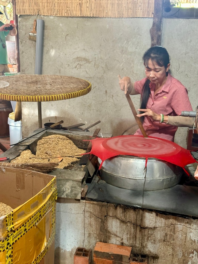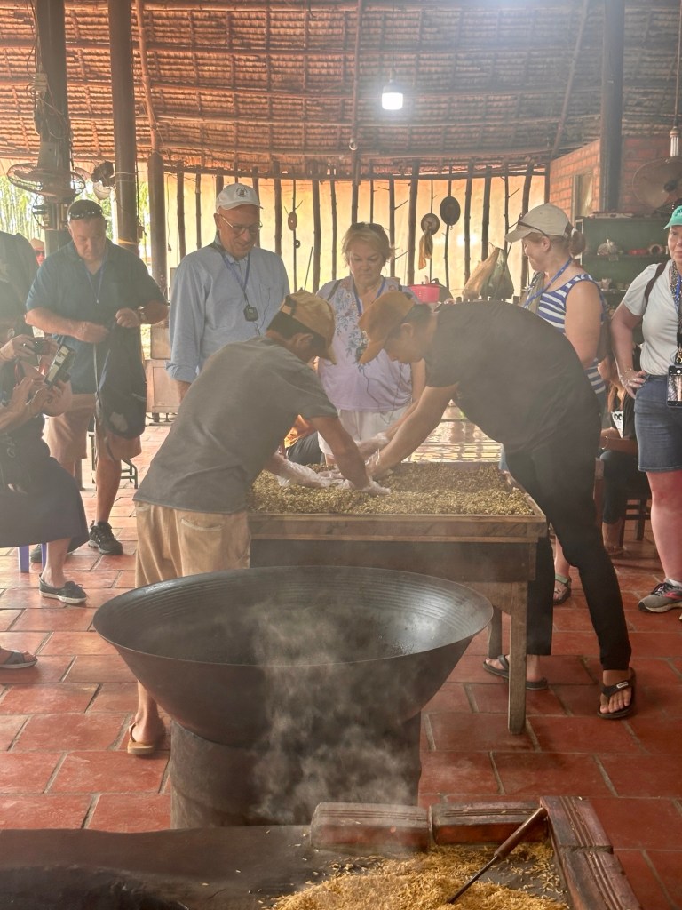 After disembarking, we visited a collection of open-air structures where multiple local families work side by side practicing traditional trades. We observed the making of rice paper (the edible kind, not for writing), popped rice, and coconut toffee. This stop also provided an opportunity to shop for the very items being demonstrated.