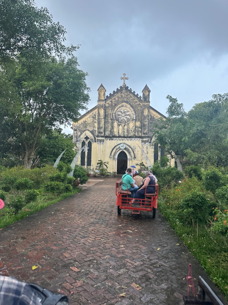 Our final stop for the day took us across the island by tuk tuk, weaving through mango groves on the way to a Catholic monastery. Catholicism was introduced to Vietnam during the French colonial period, and today about 10% of the population practices the faith. Travelers should always be prepared for the possibility of rain in Vietnam, and just before an afternoon downpour, we were thoughtfully provided with rain ponchos—an addition that only enhanced the sense of adventure.